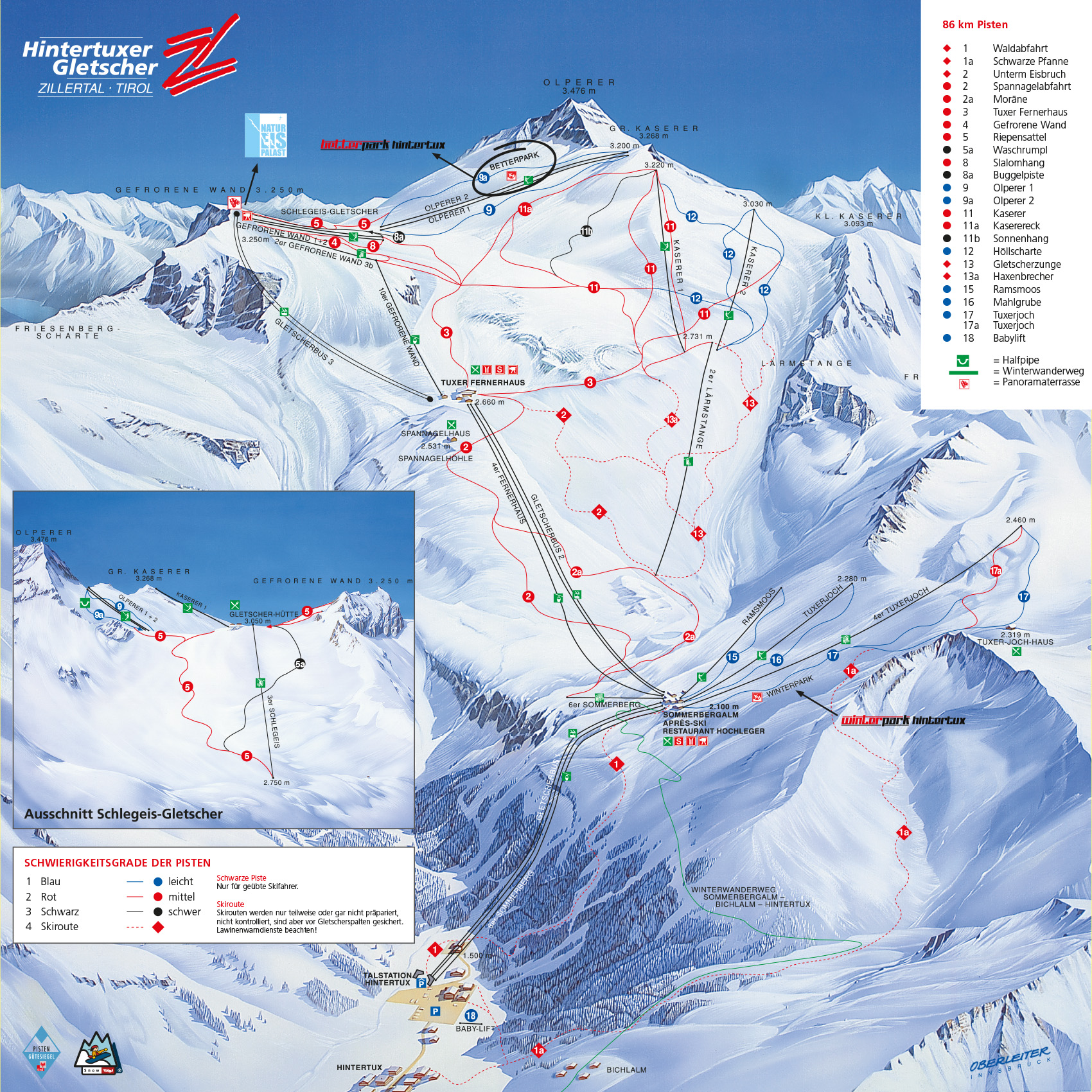 Höhe: 1500 m - 3200 m Pisten: 86 km Skilifte: 20 Pistenplan: Hintertuxer Gletscher Auch im Sommer sind i. d. R. 18 km Skipiste mit 9 Liftanlagen geöffnet. Skipass