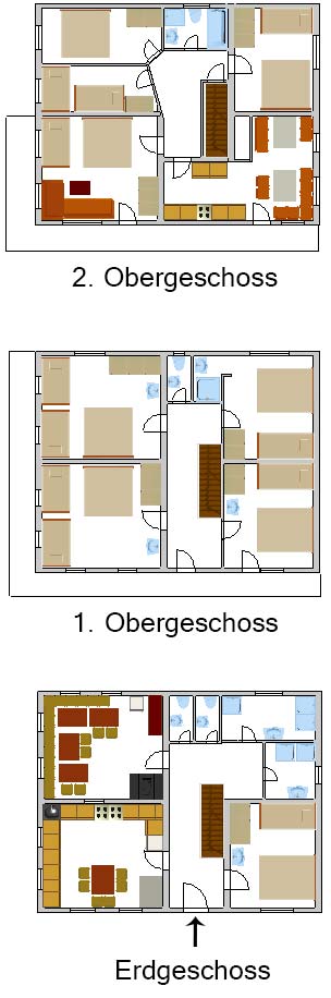 Unser Ferienhaus Tux bietet auf 3 Etagen Platz für bis zu 27 Personen. Für einen Grundriss des gesamten Hauses bitte hier klicken! Aufteilung: Erdgeschoss: Eingangsbereich und Treppenhaus. Gemütliche, holzvertäfelte Stube für ca. 20 Personen mit Kachelofen (nur Dekoration), Sat-TV, DVD-Player, Kühlschrank. Geräumige, neue Küche mit 2 x 4-Plattenherd, Backofen, Mikrowelle, Geschirrspüler, Toaster, Wasserkocher, Kühlschrank mit Gefrierfach, Essecke, Durchreiche zur Stube. 1 Dreibettzimmer mit Waschbecken. 2 getrennte WCs. 1 Bad mit Waschbecken und 2 Duschkabinen. 1 Bad mit 2 Duschkabinen. Bilder der Stube und der Küche im Erdgeschoss Bilder des Schlafzimmers und der Bäder im Erdgeschoss 1. Obergeschoss:Flur und Treppenhaus. 1 Dreibettzimmer mit Waschbecken und Dusche. 1 Dreibettzimmer mit Waschbecken. 2 Vierbettzimmer jeweils mit Waschbecken. 1 WC am Flur. Balkon vom Flur und von einem Dreibettzimmer aus zugänglich. Bilder der Schlafzimmer im 1. OG weitere Bilder der Schlafzimmer im 1. OG